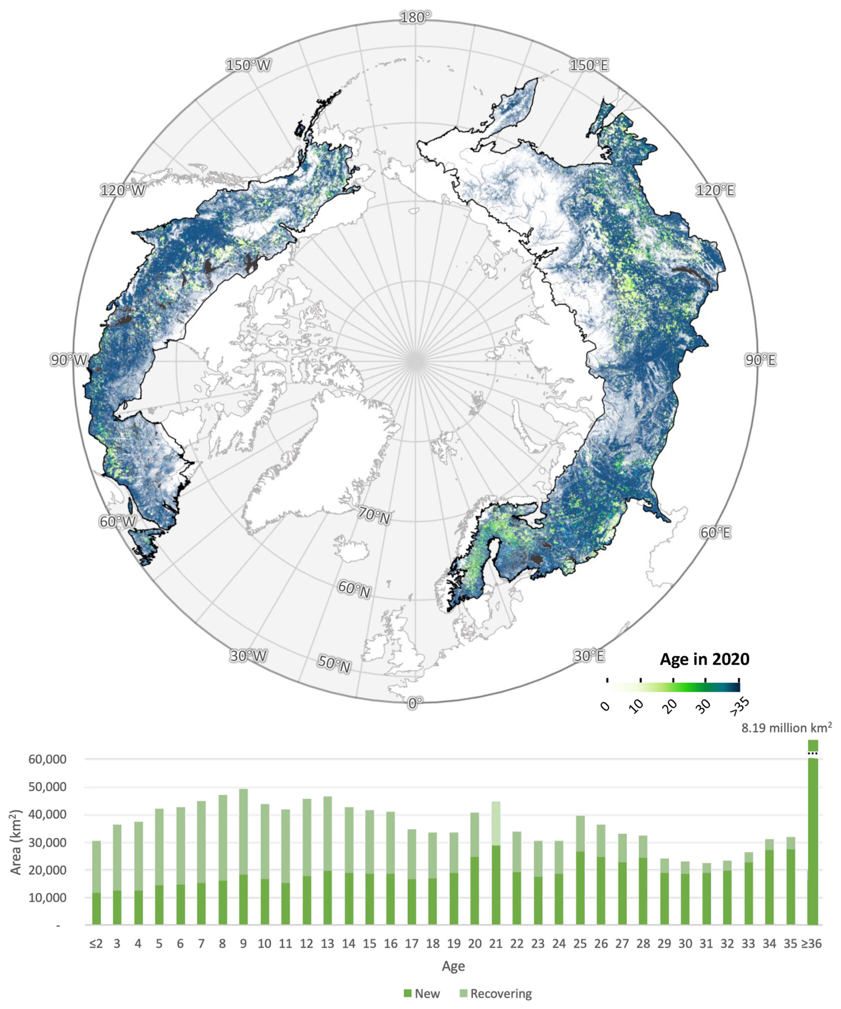 Из общей площади лесов 1985 года нарушены и восстановлены к 2020 году были 5,29 %. Молодые леса (до 21 года) сосредоточены в регионах интенсивного лесоводства, включая плантации Скандинавии, а также в районах, которые восстанавливаются после лесных пожаров. Например, в Сибири. Кстати, авторы исследования отмечают, что анализ снимков показал рост частоты и масштабов пожаров в Сибири с конца 20-го века.