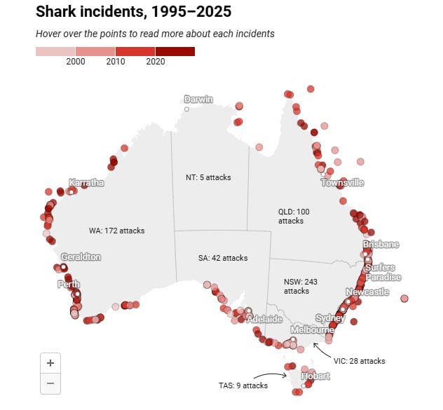 - Дожди. Вблизи от устьевых районов после осадков растет продуктивность вод, что привлекает рыб и манит акул. Подтверждено, что риск нападения белой и тигровой акулы максимален, когда осадков порядка 100 мм. Но не только в рыбе дело: дожди смывают в море все загрязнения и мусор. Изменения качества морской воды могут нарушить сенсорные сигналы, на которые полагаются акулы, что усиливает стресс и меняет из поведение.