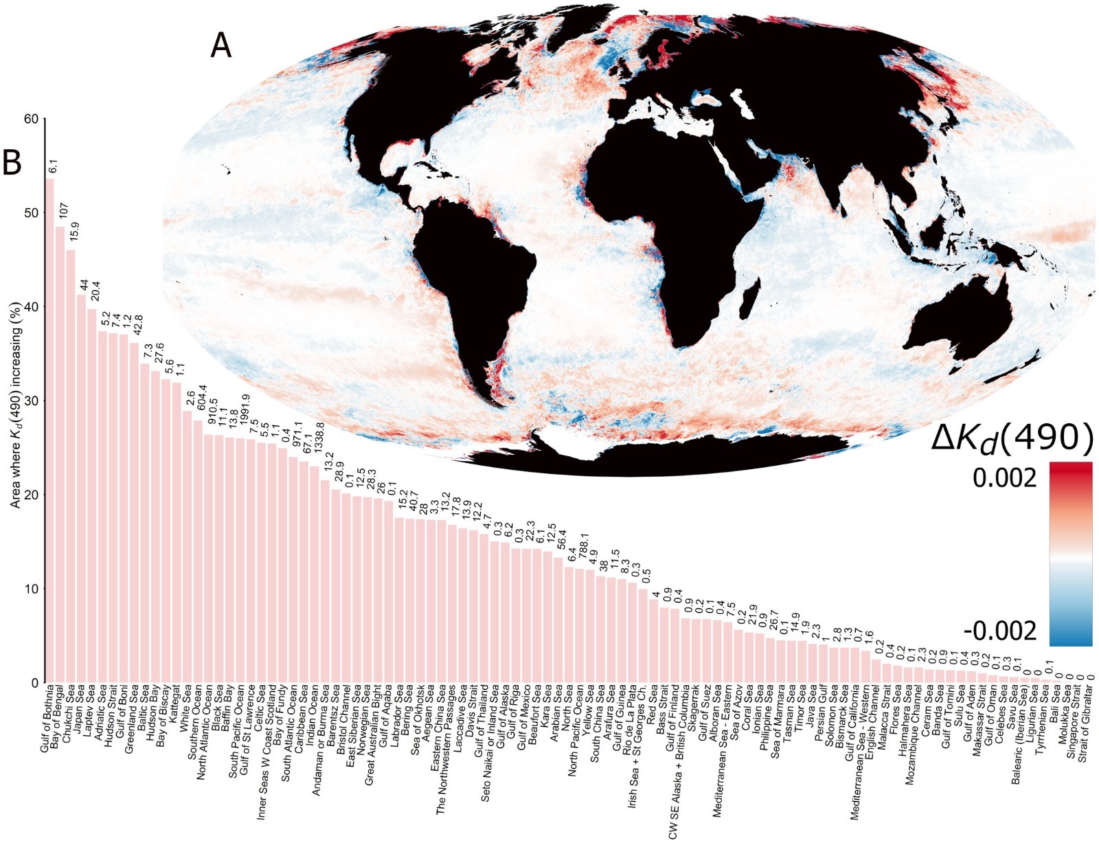 Ослабление света не ограничивается прибрежными зонами, оно также широко распространено в открытом океане, особенно в полярных регионах, северо-восточной Атлантике и северо-западной части Тихого океана.