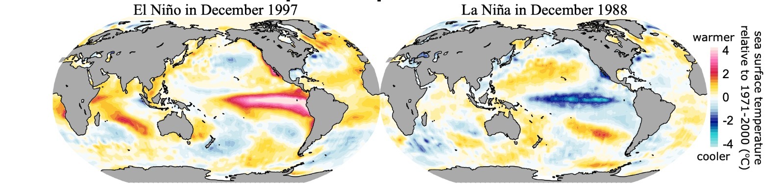По оценкам академика А.С. Монина, если верхний 100-метровый слой океана охладится всегона 0,1 градуса, то за счет различия теплоемкости и плотности температура всей атмосферы повысится на 6 градусов. Когда наблюдалось Эль-Ниньо, глобальная температура повышалась. Когда наблюдалось Ла-Нинья, отмечали противоположный эффект: в Перуанском течении температура становилась еще ниже, это в экваториальном районе Тихого океана, а потом уже и в Атлантическом, то это приводило к понижению глобальной температуры, поскольку наблюдался сток тепла из атмосферы в океан.