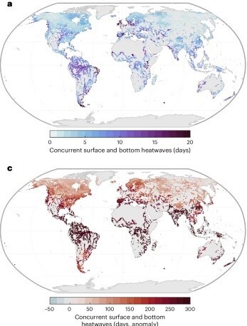 Ученые проанализировали данные о температуре десятков тысяч озер по всему миру (1980-2022 гг) и выявили моменты превышения пороговых значений экстремальной температуры в придонных горизонтах. По моделям они оценили, что произойдет при различных сценариях эмиссии парниковых газов до конца текущего столетия.