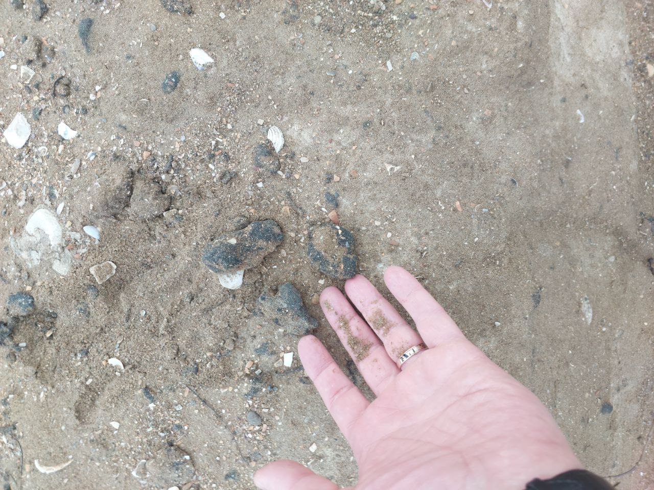 Погода на побережье ветреная: песок сметает, обнажая загрязненные мазутом кусочки грунта.