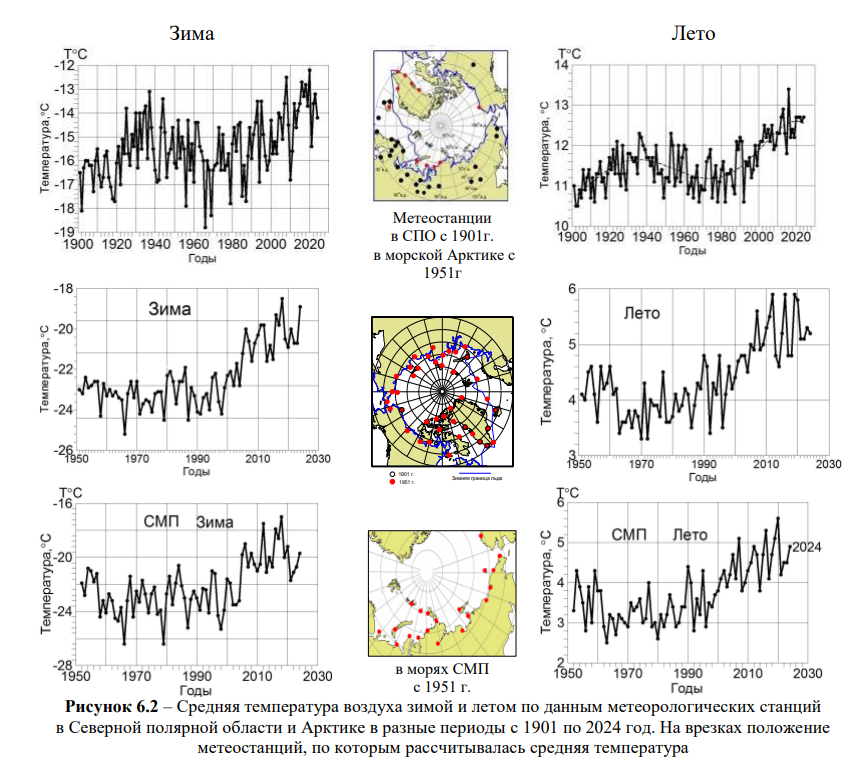 В морской Арктике температура с 1990-х годов повысилась к 2018-2020 гг. зимой более чем на 4°С, а летом – на 2°С. В акватории Карского – Чукотского морей (район Северного морского пути) особенно заметно потеплело в 2010-е годы (зимой на 6 градусов с 1970 по 2018 гг, летом – на 3 градуса).