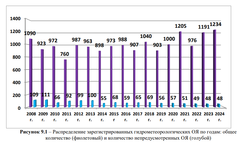 2024 год в России был аномальным по количеству опасных гидрометеорологических явлений. Их зафиксировано 1234 в целом, а 493 из них нанесли значительный ущерб отраслям экономики и населению. В 2024 году увеличилось: количество очень сильных осадков на 19%; очень сильного ветра на 4%; сильной жары и аномально жаркой погоды на 24 %; а также сильного гололеда на 48%.