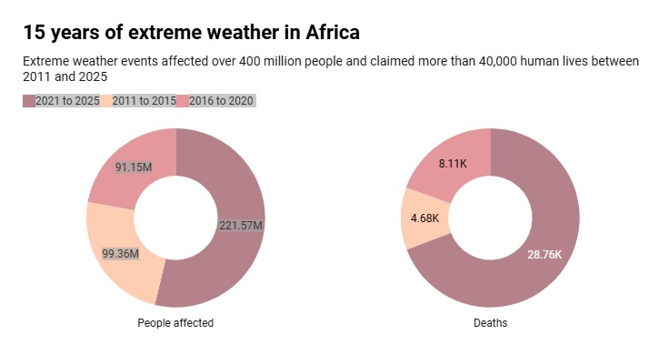 От экстремальных погодных условий в Африке пострадали более 221,57 млн человек за последние 4.5 года – с 2021 до мая 2025 года. Число погибших - 28 759 (в 3 раза больше, чем за период с 2011 по 2020 гг.). К такому выводу пришли специалисты компанией Down To Earth (DTE), проведшие анализ данных из международной базы информации о чрезвычайных ситуациях (EM-DAT). Причиной бедствия для жителей стали катастрофические засухи, наводнения, циклоны, оползни, периоды сильного похолодания и экстремальной жары.