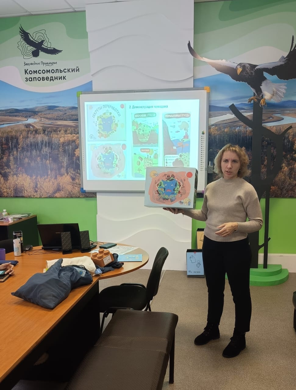 Узнать все о «Секретах переработки» пришли сотрудники отдела экологического просвещения особо охраняемой природной территории, активисты и педагоги партнерских организаций Общества. Мероприятие провела координатор образовательных проектов Хабаровского краевого отделения ВООП Людмила Рыжова.