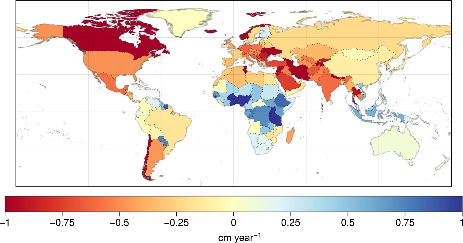 рис: Долгосрочные осредненные тенденции (по странам) запасов вод суши по данным GRACE/FO