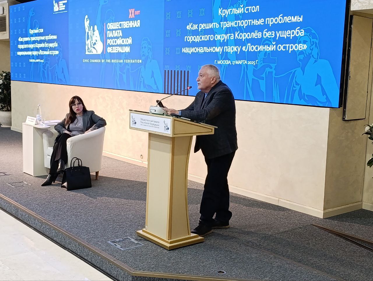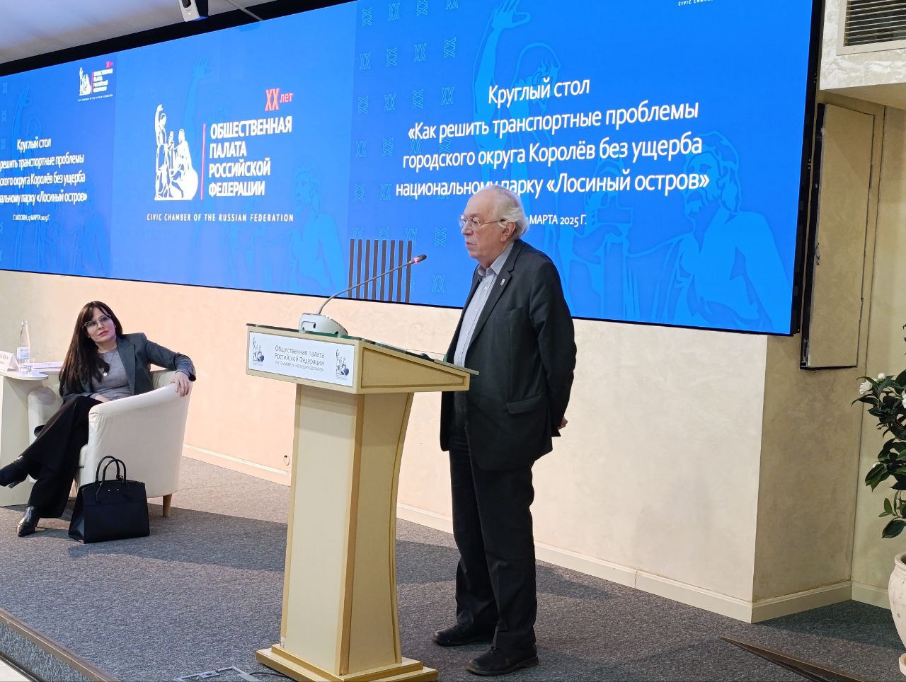 Предыстория такова: жителям Королева и окрестностей чрезвычайно трудно выезжать из города по утрам и въезжать обратно по вечерам. Требуется решение проблемы. Администрация города разработала проект строительства двух дорог – одной через центр города, другой – через национальный парк «Лосиный остров». Экологи – категорически против. И законодательство на их стороне: «Лосиный остров» как особо охраняемая природная территория (ООПТ) защищен соответствующим федеральным законом. Конфликтная ситуация вокруг этой темы была вынесена на уровень Президента страны в декабре 2024 года, а в феврале 2025 появилось поручение В.В. Путина № Пр-292 (пункт 1, подпункт «г») в той формулировке, которая и была представлена на круглом столе.